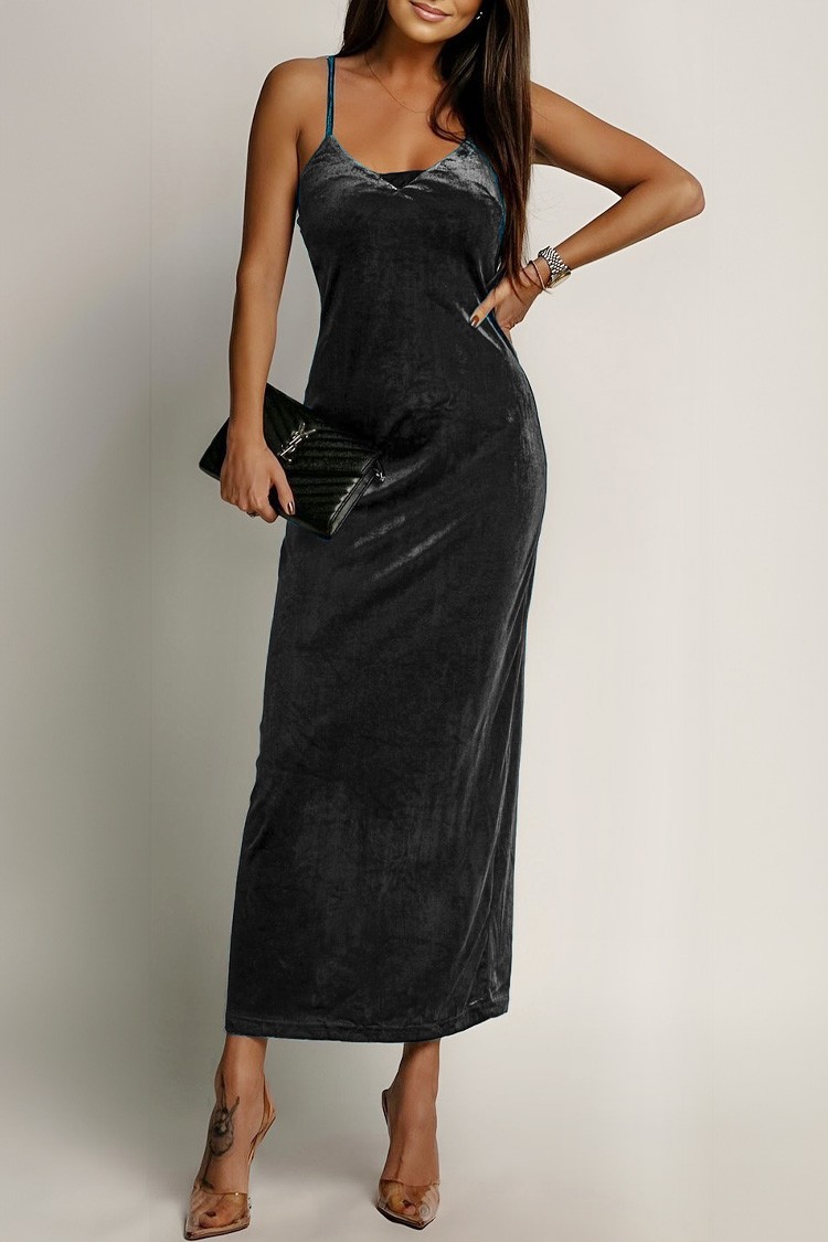 - Haljina ima uski kroj, tanke naramenice i dugu duljinu. Model se kopča skrivenim rajsferšlusom na leđima.