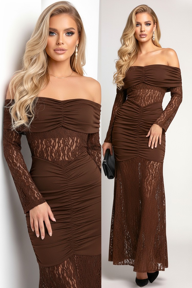 - Model ima uski kroj, duge rukave, seksi spuštena ramena i efektnu čipku.