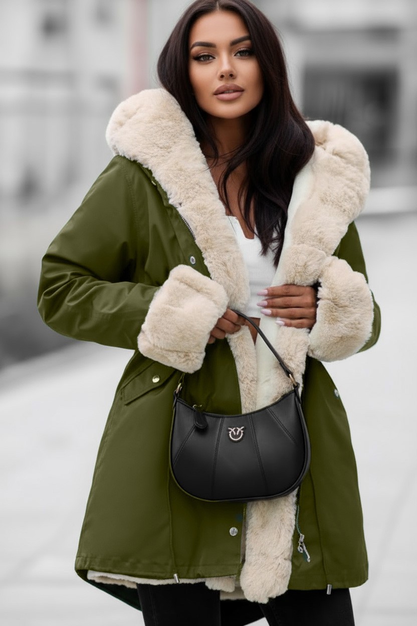 - Model ima udoban kroj, zakopčavanje na gumbe i patentni zatvarač, voluminoznu kapuljaču s perjem i manžetama.
