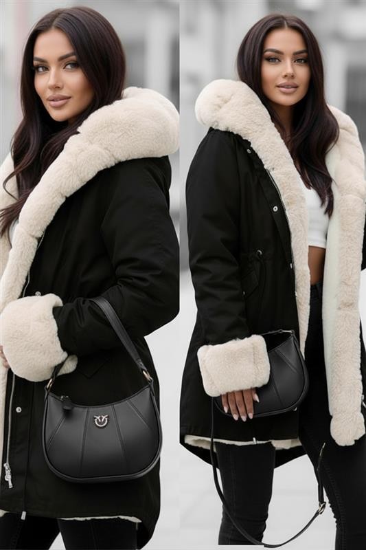- Model ima udoban kroj, zakopčavanje na gumbe i patentni zatvarač, voluminoznu kapuljaču s perjem i manžetama.