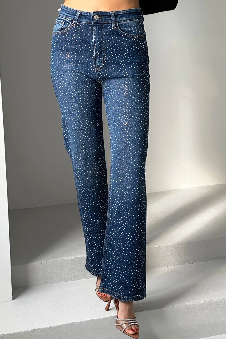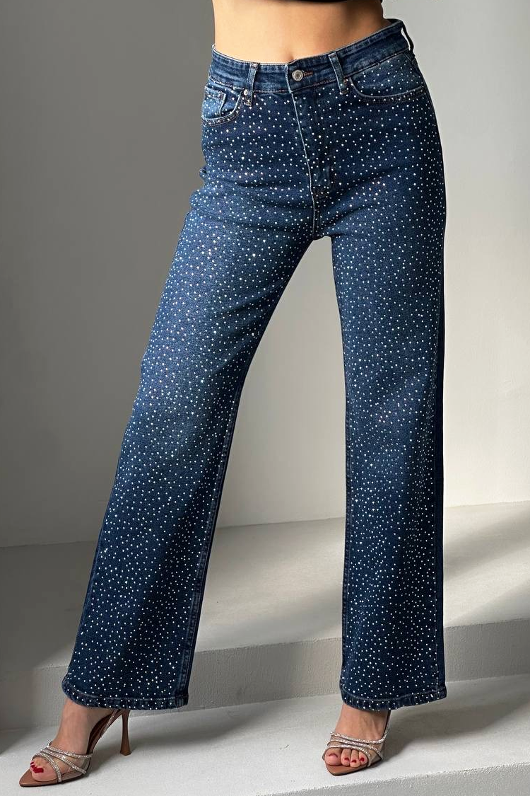 - Model ima visoki struk, široke nogavice, džepove i sjajne detalje sprijeda.