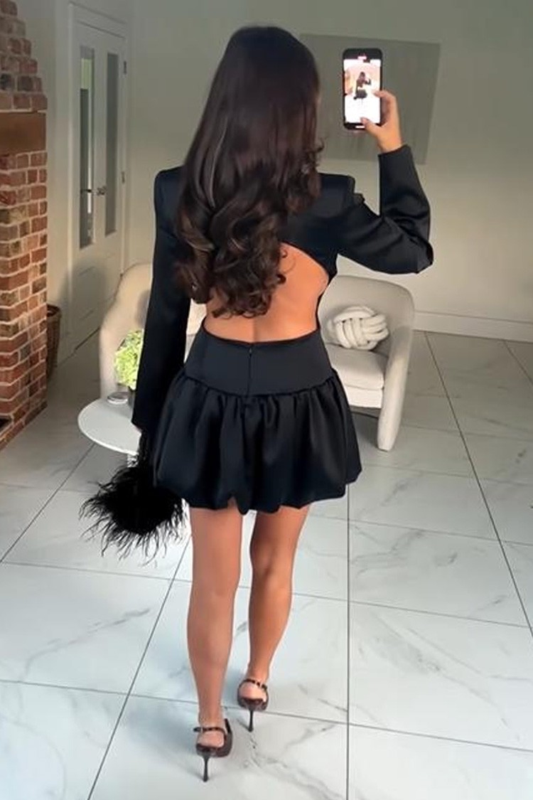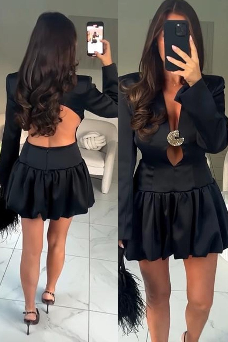 - Model ima V-oblikovani dekolte sa zlatnim detaljima, seksi gola leđa, duge rukave i patentni zatvarač na stražnjoj strani za lakše oblačenje.