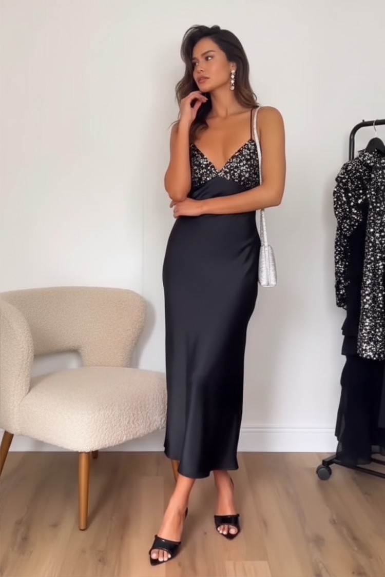 - Model ima tanke naramenice, spektakularan svjetlucavi dekolte i seksi pripijeni kroj.