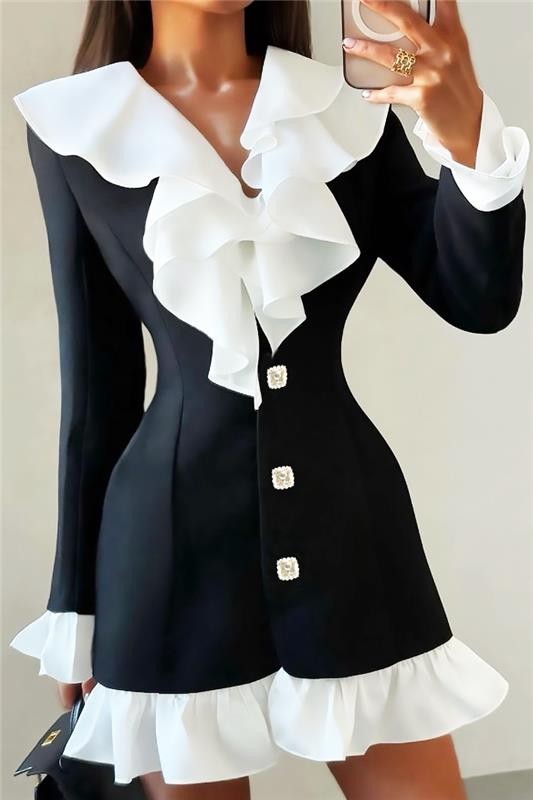 - Model ima uski i klasičan kroj, duge rukave, elegantne gumbe i spektakularne bijele volane.