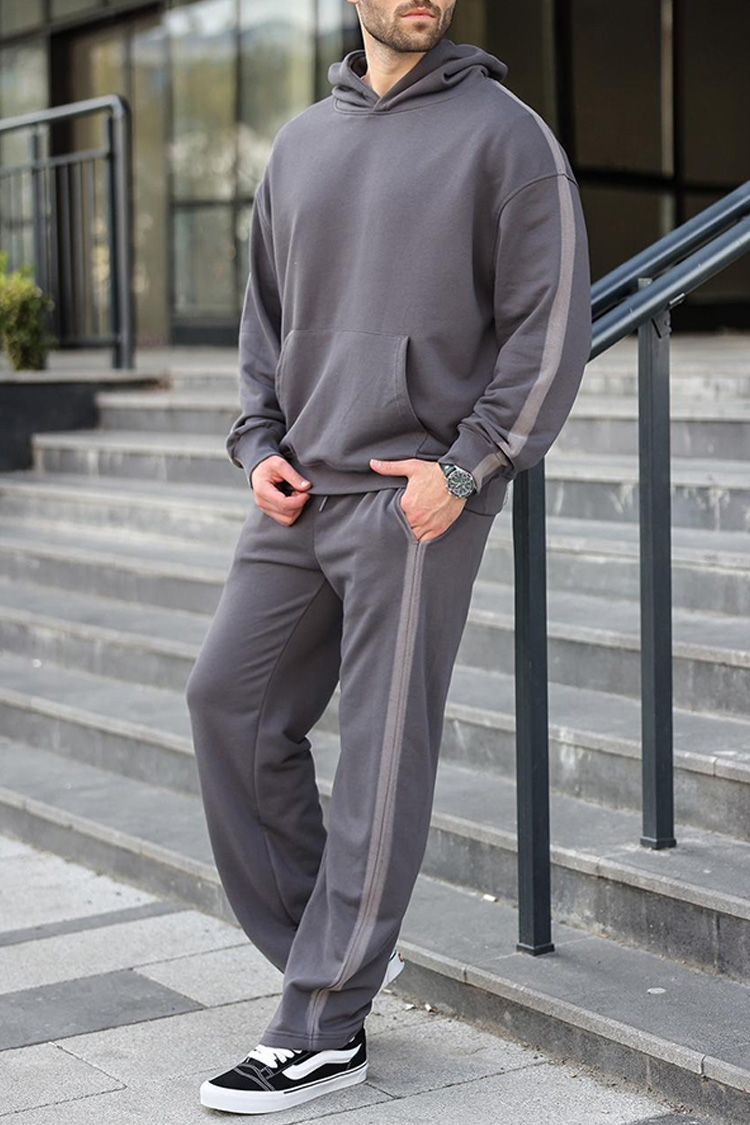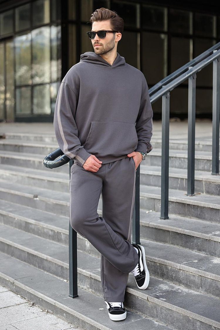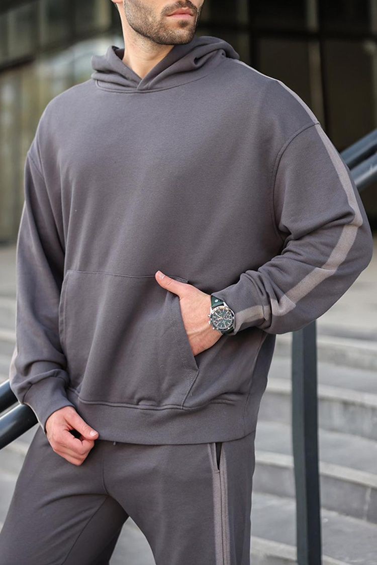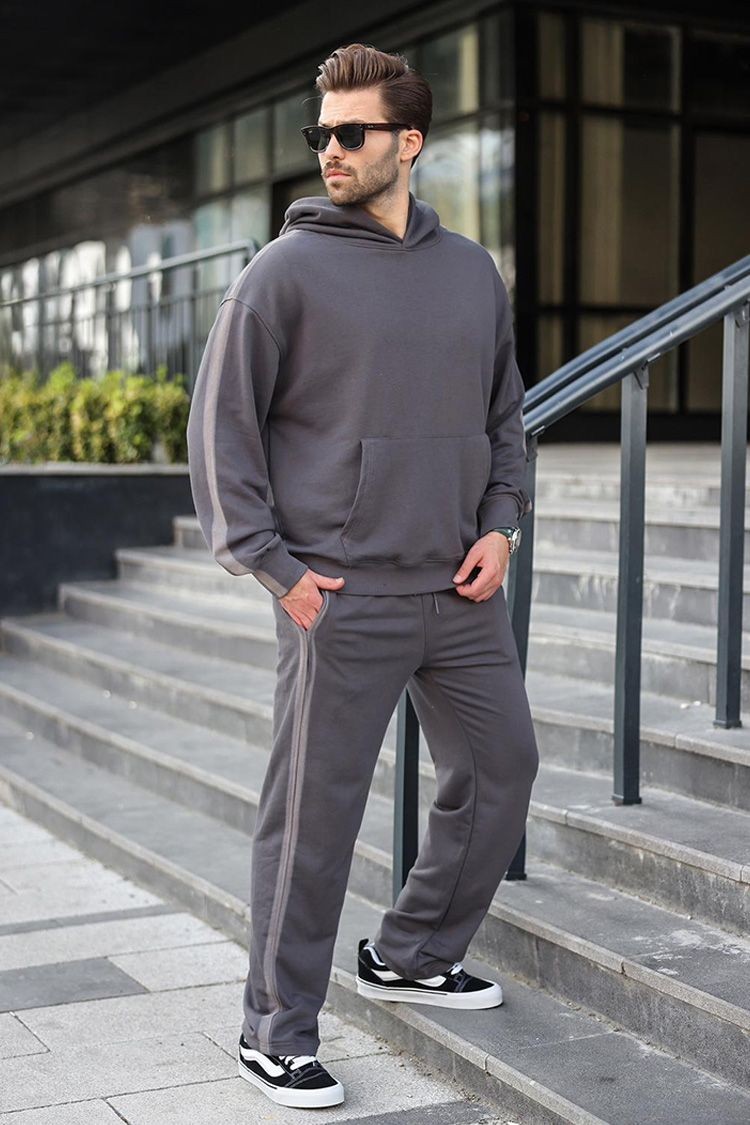 - Udoban muški dvodijelni set u klasičnoj boji, koji se sastoji od majice s kapuljačom i hlača.