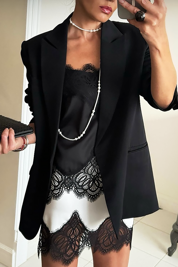 - Suknja je kratka, ima dvobojni uzorak i čipku, a top ima tanke naramenice i seksi dekolte.