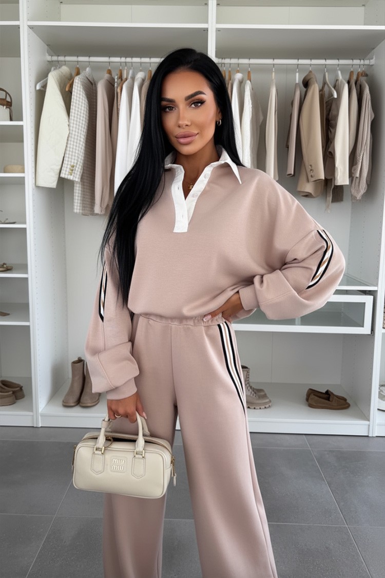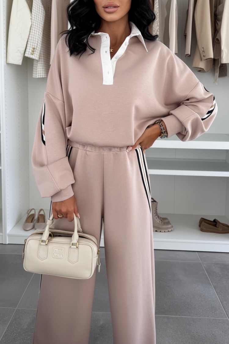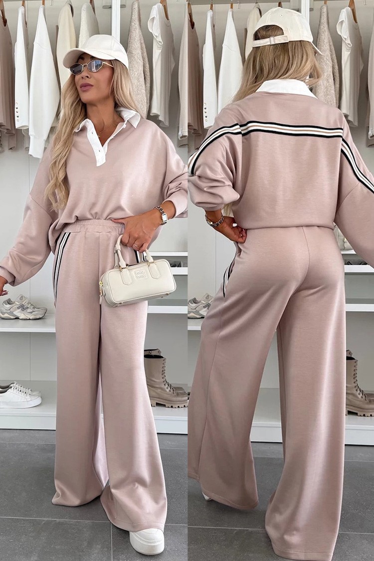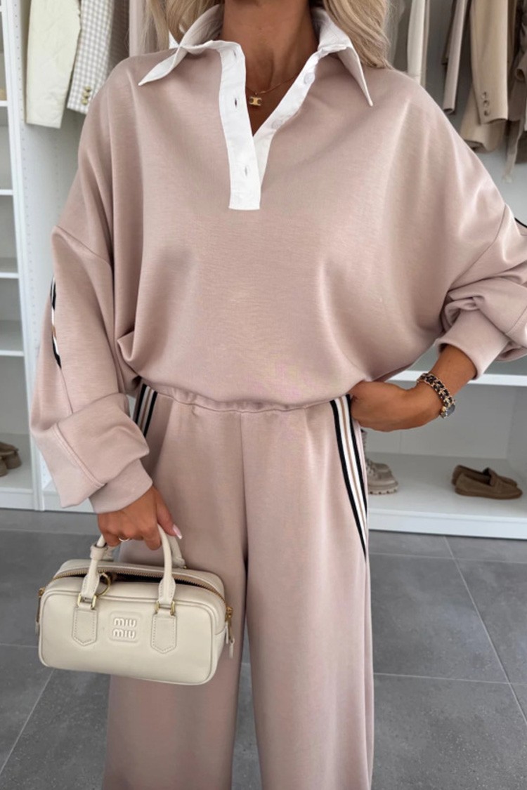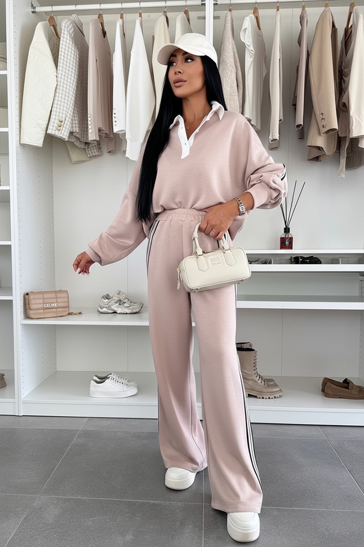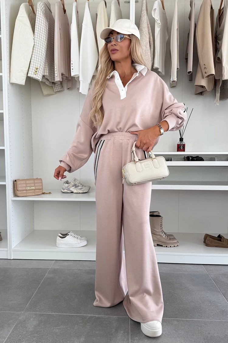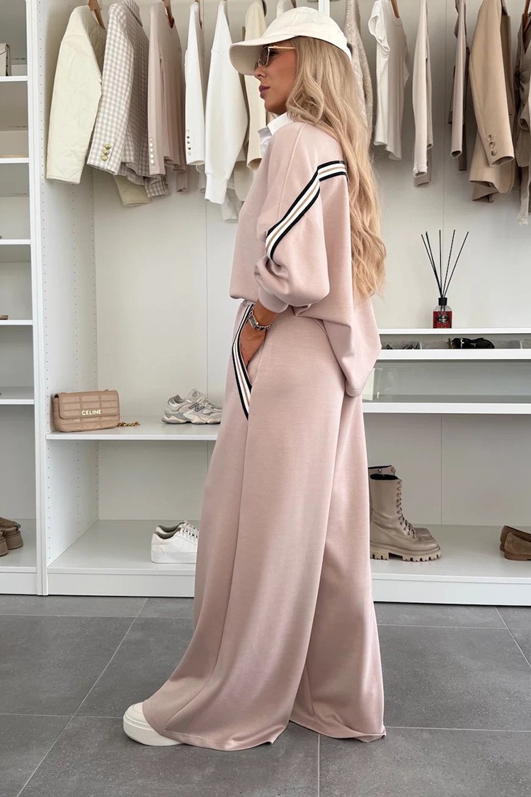 - Bluza ima predimenzionirani kroj i spektakularan ovratnik, a hlače imaju zvonasti dizajn i visoki elastični struk.