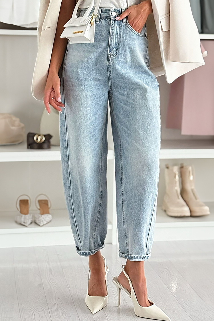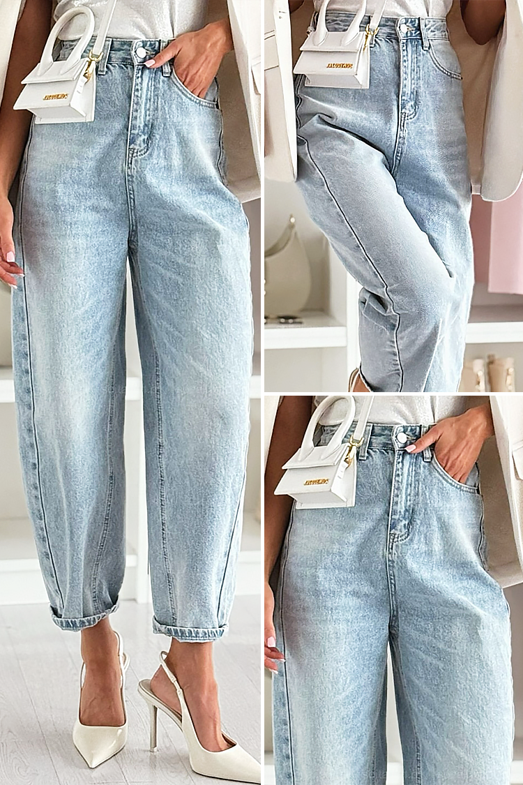 - Model ima visoki struk, širok kroj i čist dizajn.