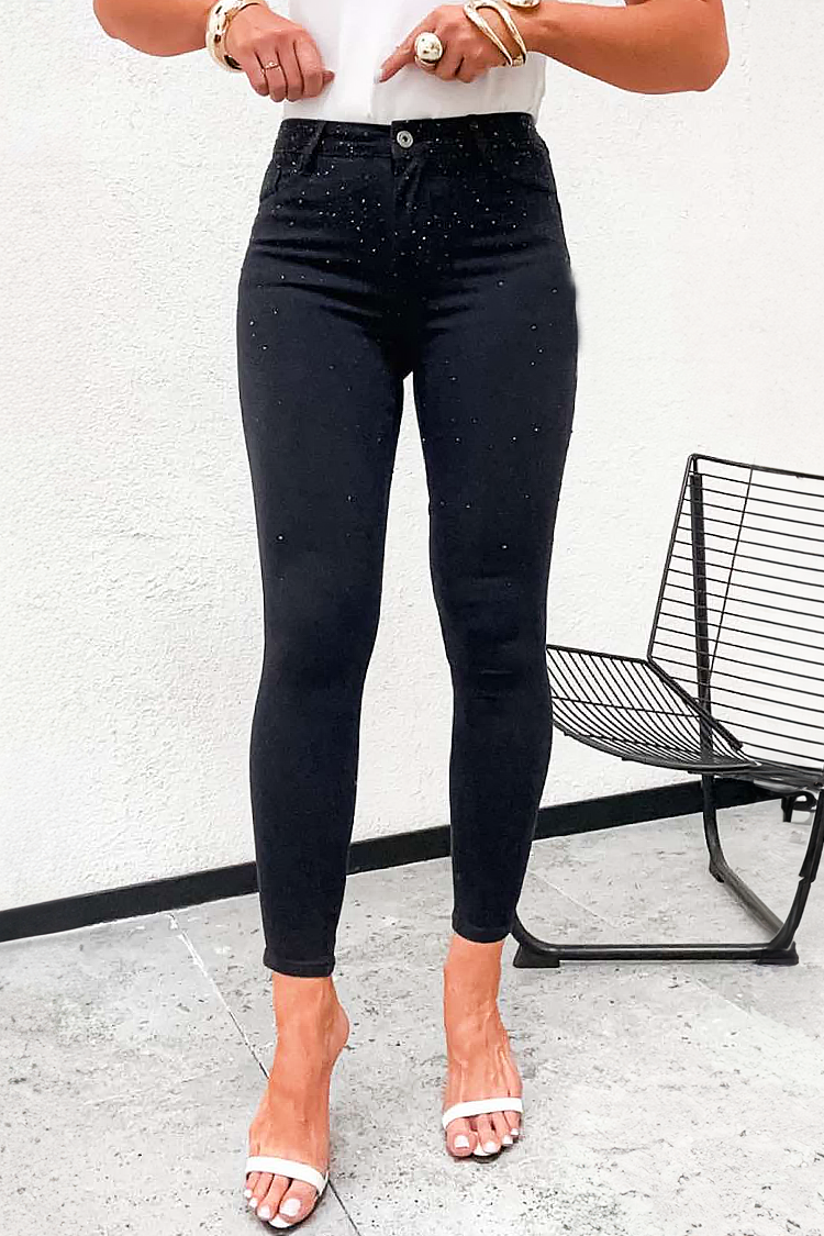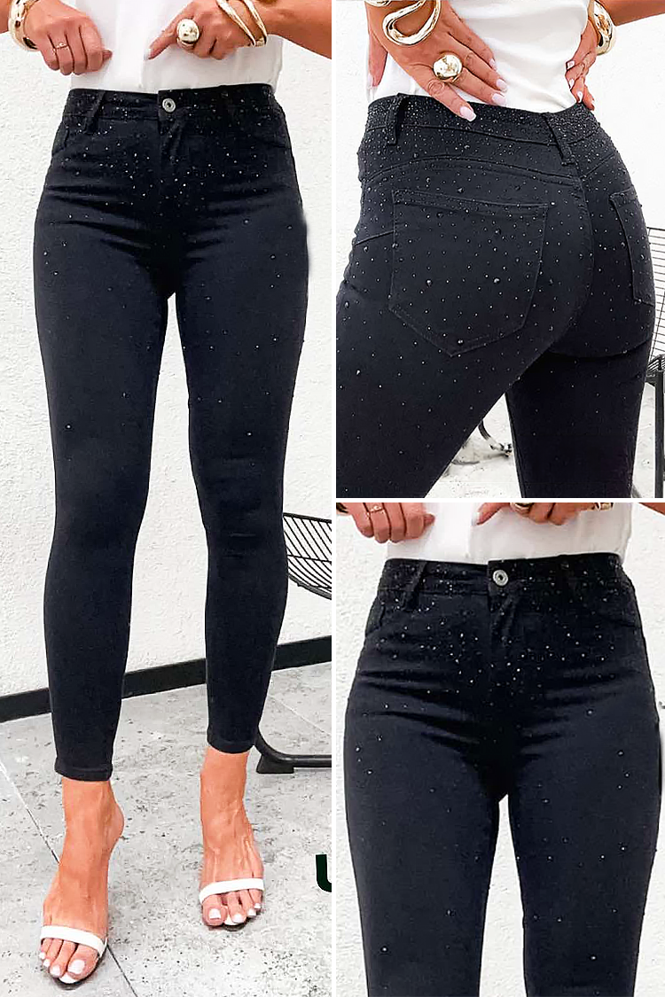 - Model ima visoki struk, pripijeni kroj i sjajne, ukrasne elemente.