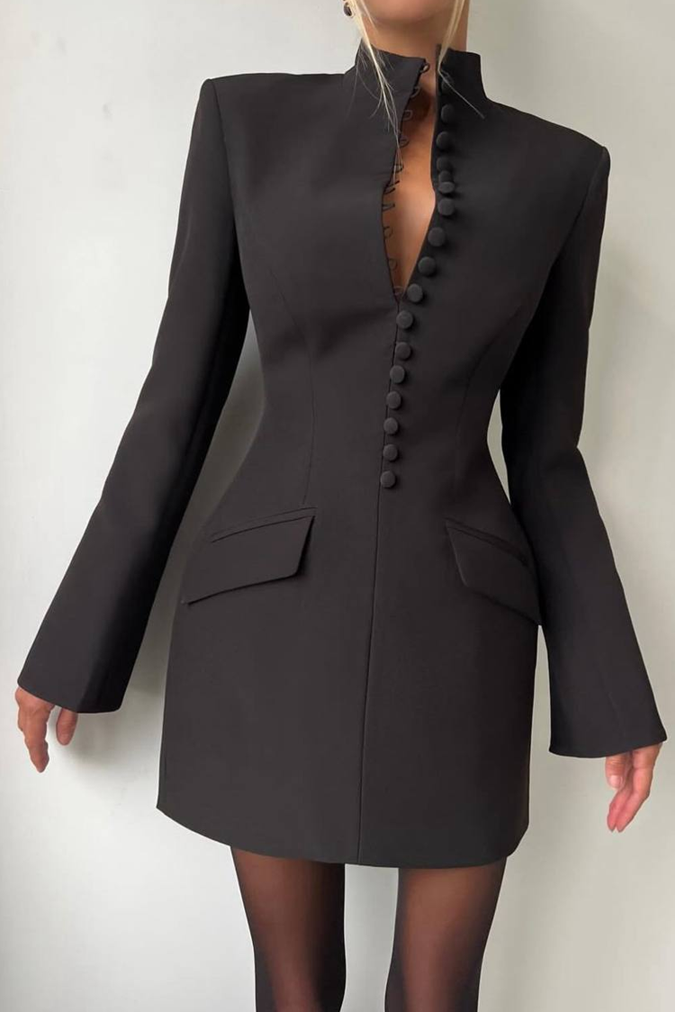- Haljina ima elegantan kroj-blejzer, kopčanje na gumbe, duge rukave i elegantne džepove.