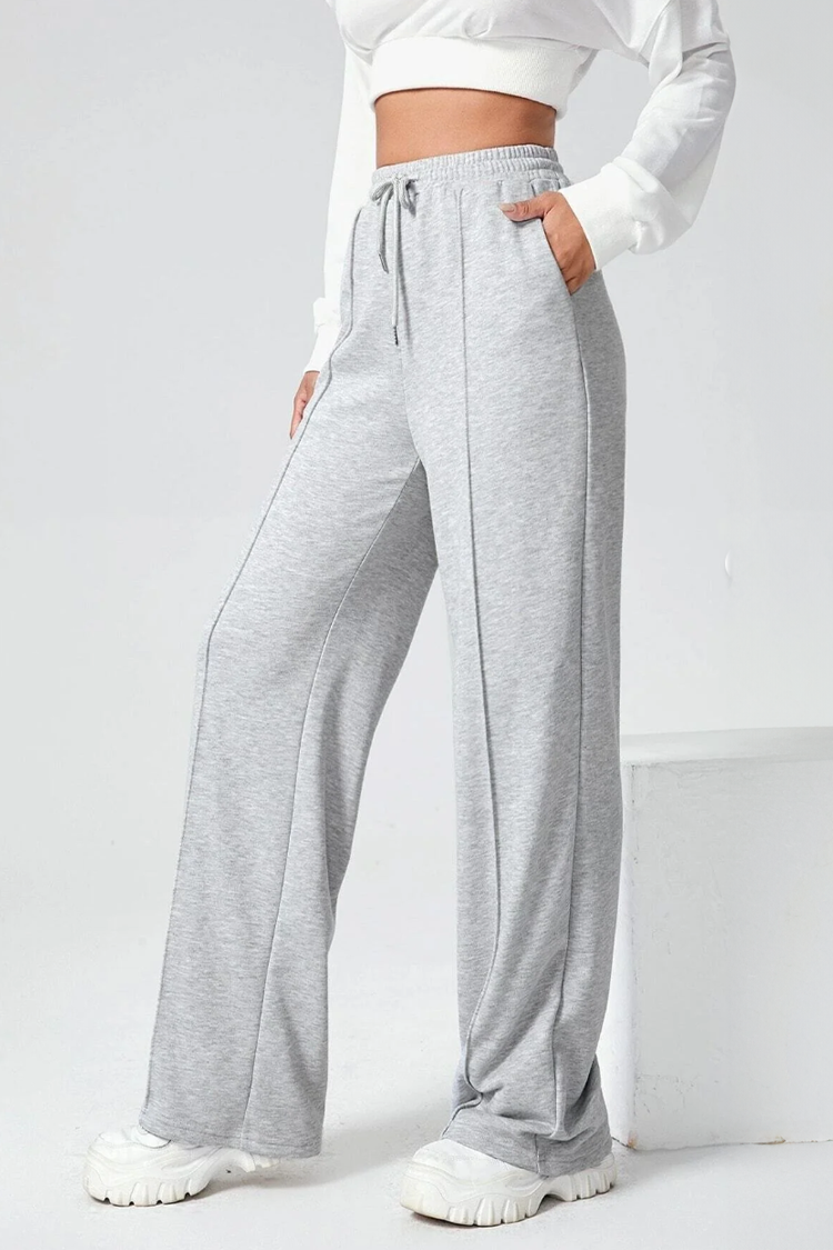 - Model ima visoki, elastični struk s vezicama, bočne džepove i široke nogavice.