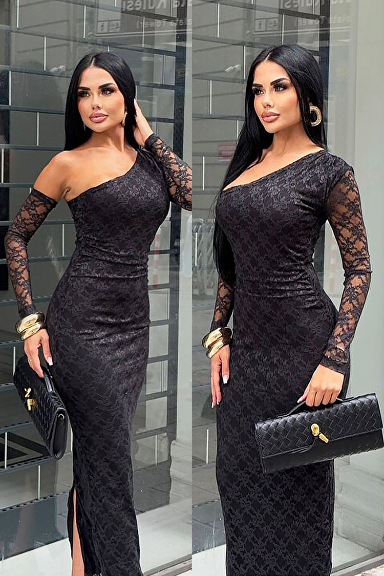 - Model je izrađen od spektakularne čipke s asimetričnim dekolteom i dugim rukavima, od kojih se jedan može skinuti.