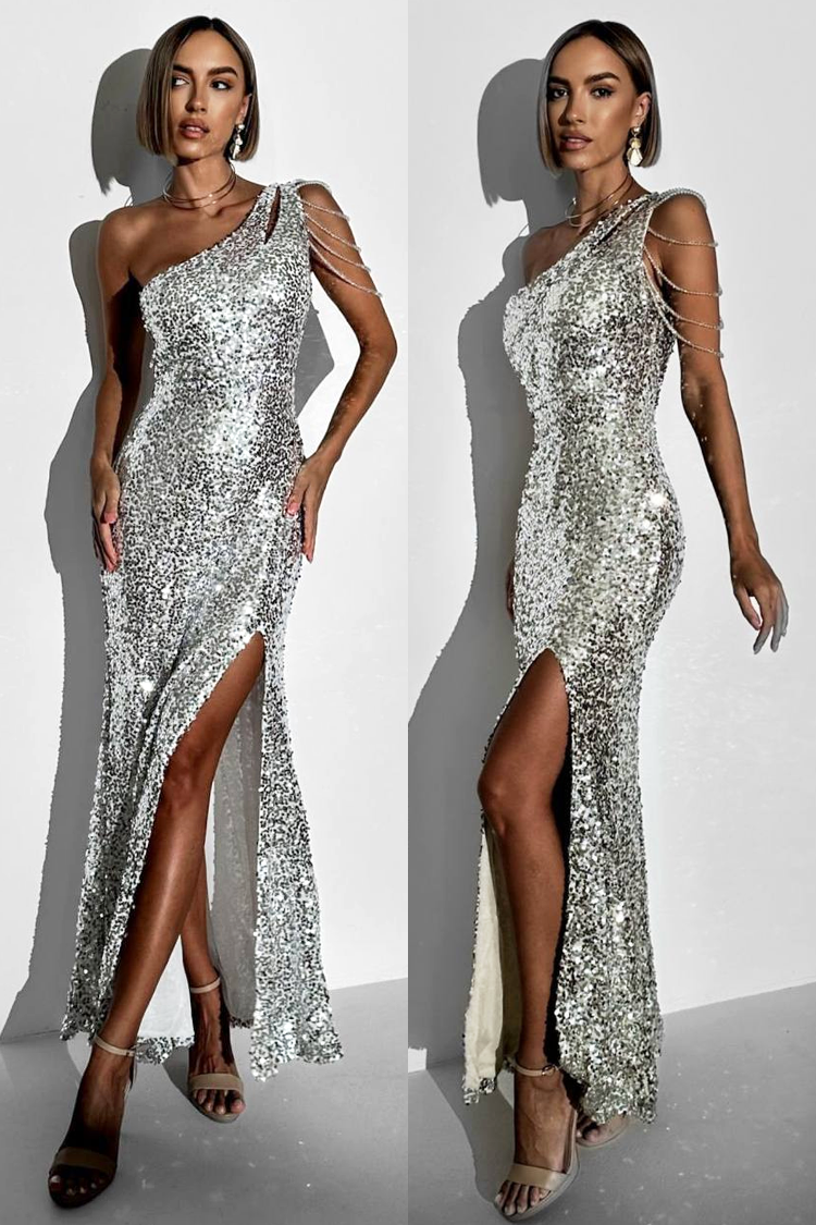 - Model ima asimetrični dekolte, spektakularan detalj s lancima na jednom ramenu i visoki prorez koji elegantno naglašava siluetu.