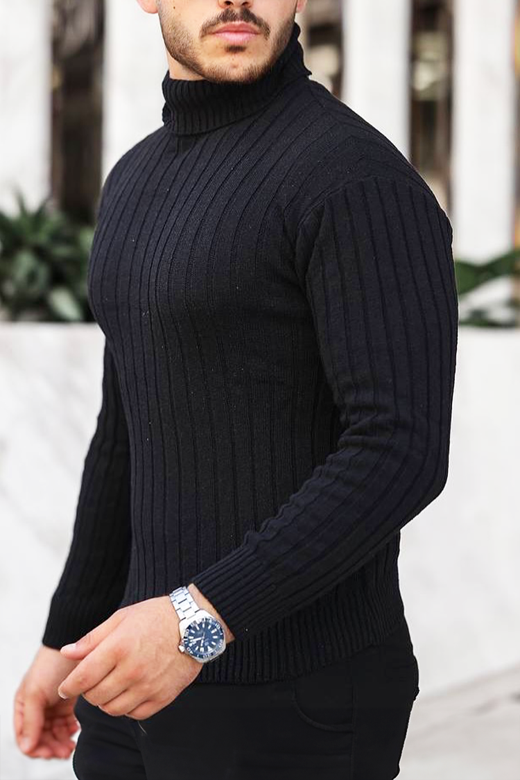 - Udoban muški džemper s polo ovratnikom i okomito rebrastim uzorkom u crnoj boji, pogodan za razne modne kombinacije.