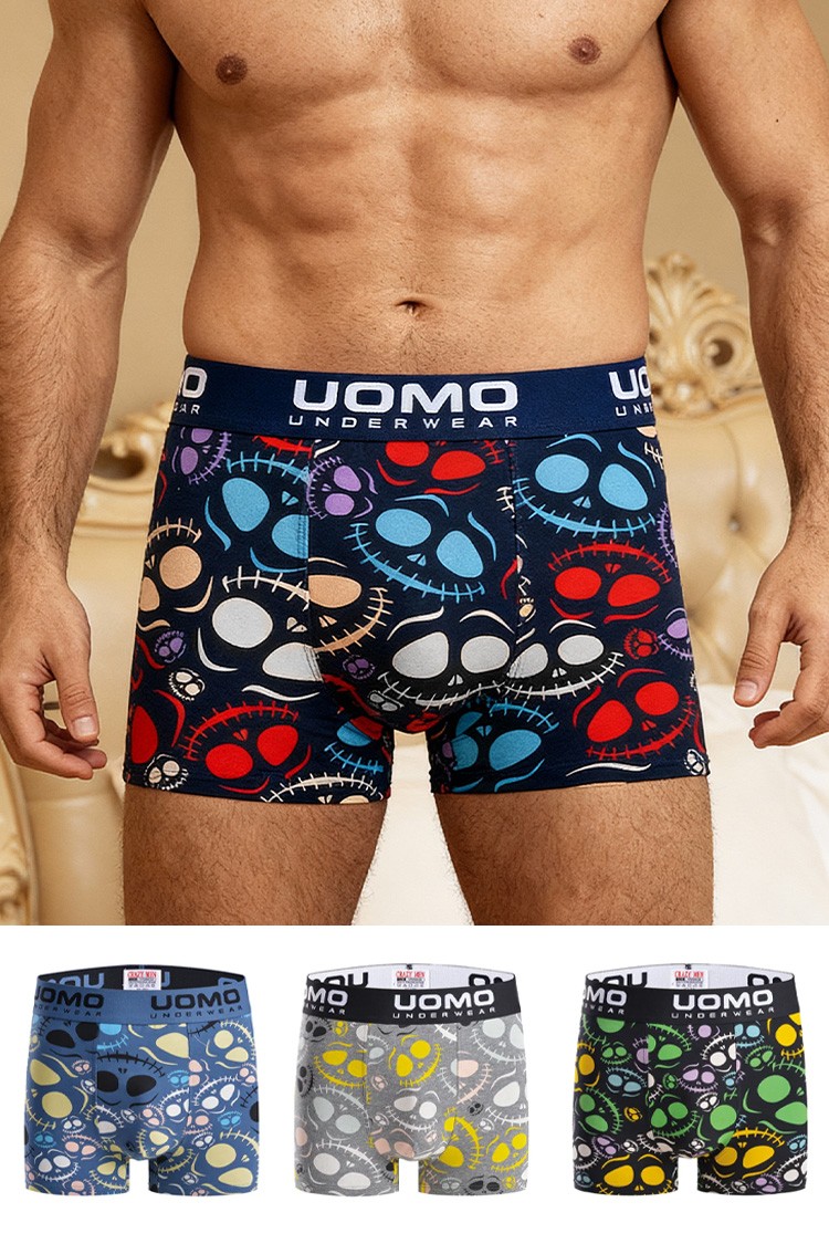 - Set od četiri muške bokserice osnovnog dizajna s elastičnim pojasom i natpisom, izrađene od pamuka, prozračnog materijala.