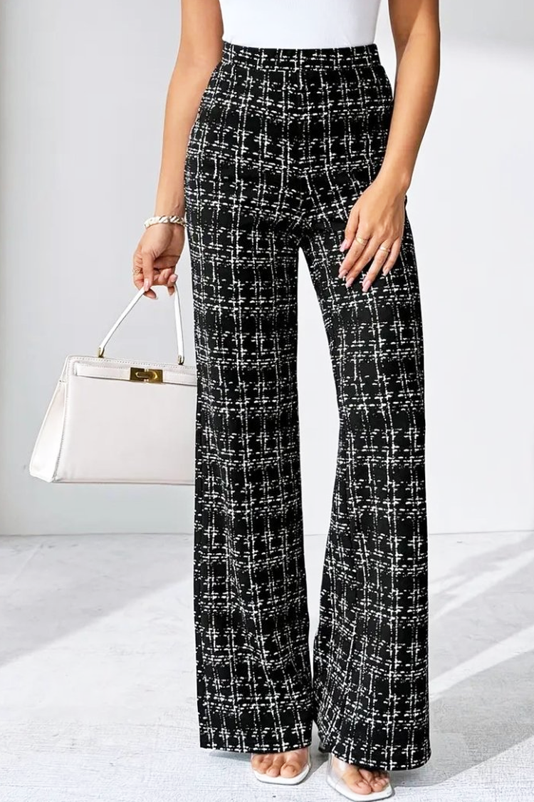 - Model ima visoki struk, široke nogavice i spektakularan uzorak.