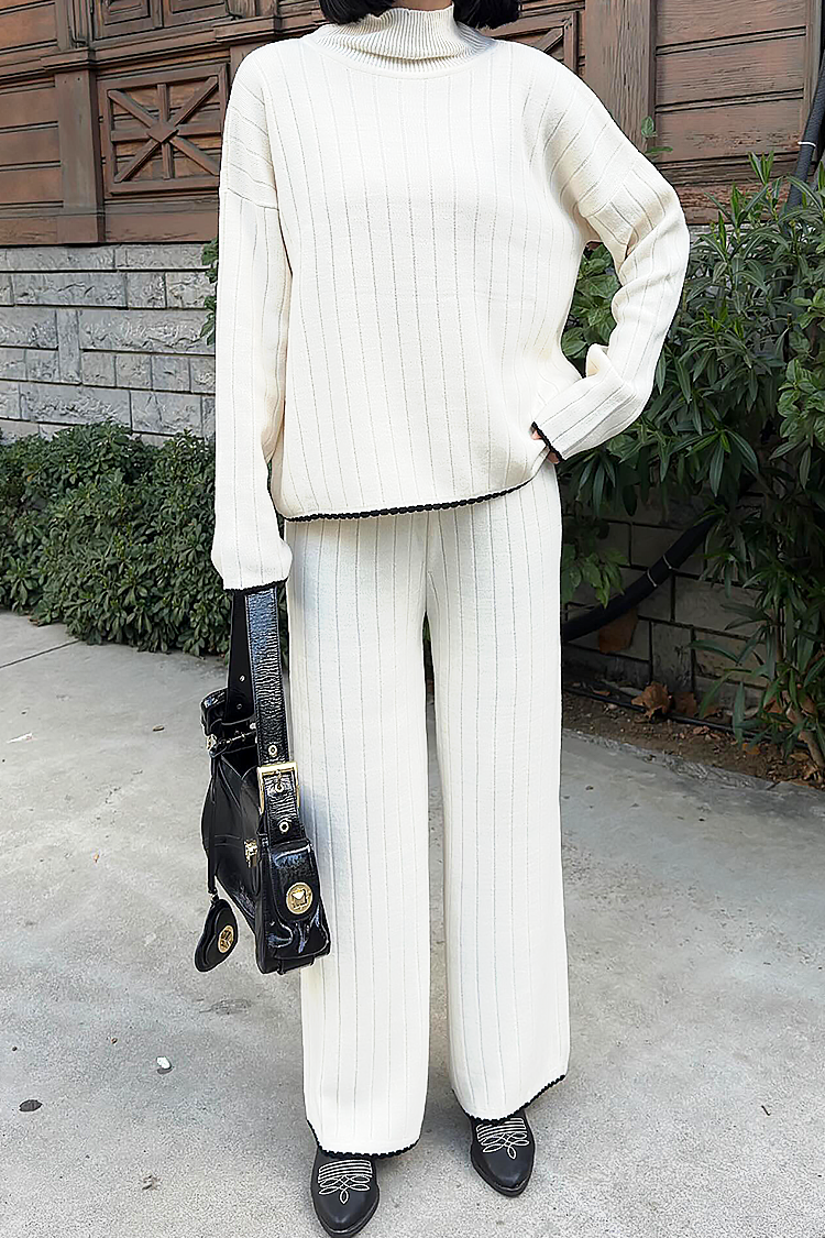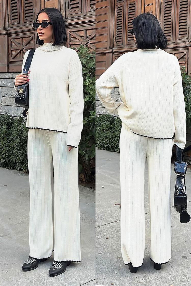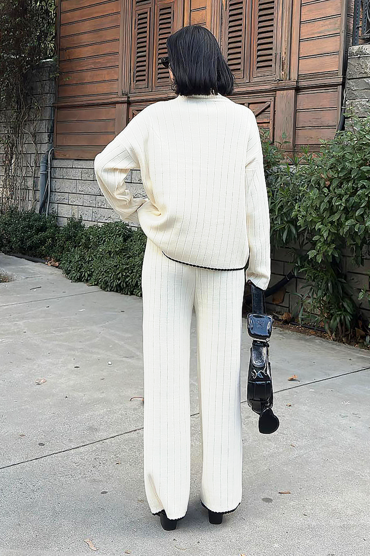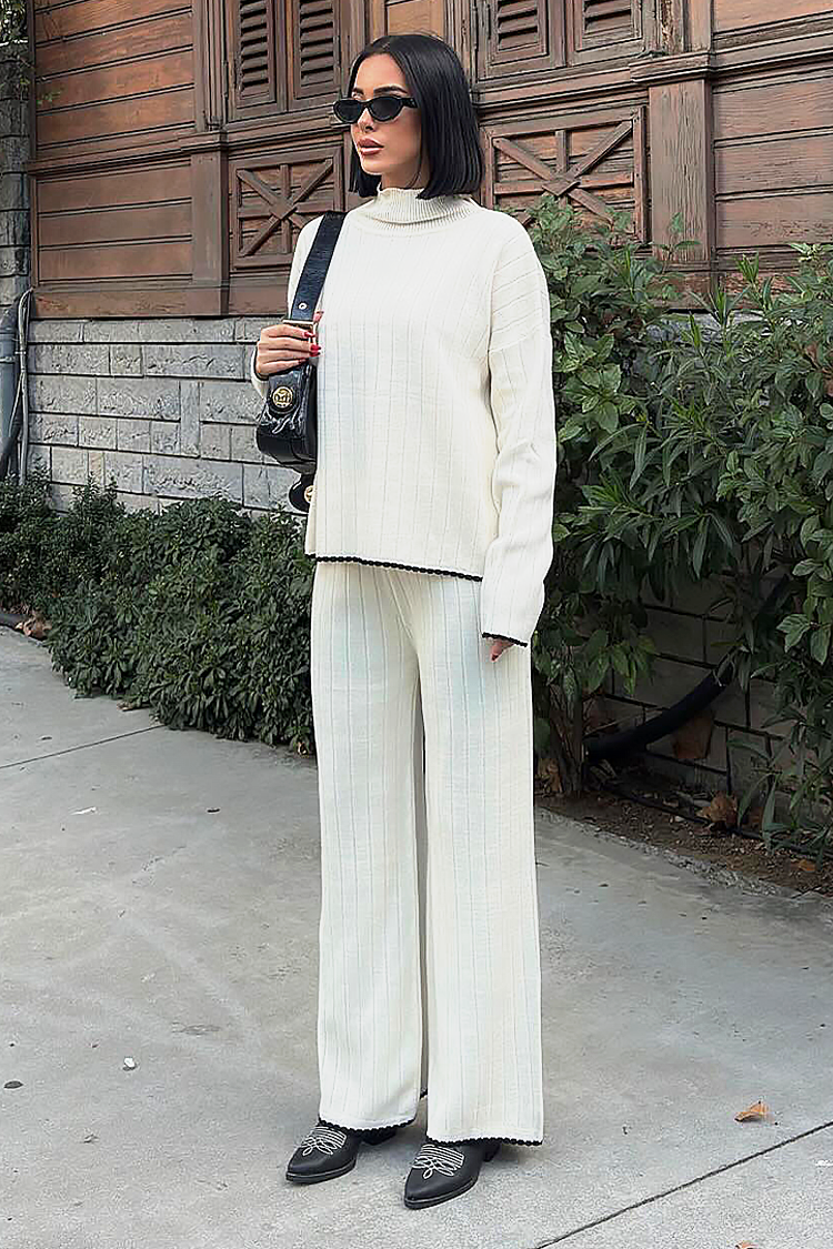 - Bluza ima široki kroj, a hlače visoki struk i široke nogavice.