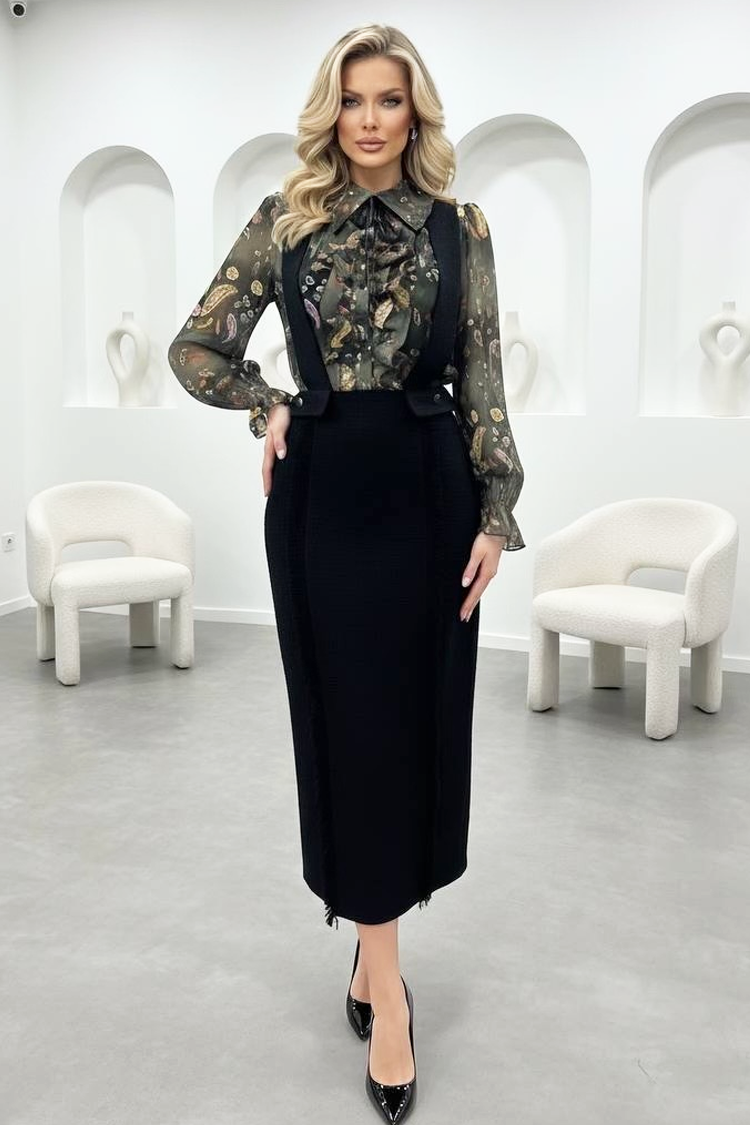 - Model ima pripijeni kroj, elegantne tregere i spektakularan šifonski gornji dio s dugim rukavima.