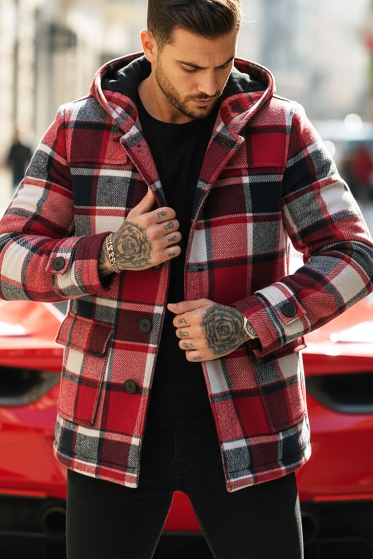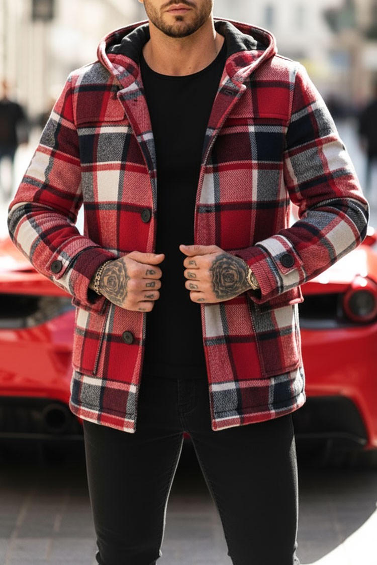 - Praktični muški kaput u crvenoj boji s kariranim uzorkom, izrađen od visokokvalitetne i tople tkanine.