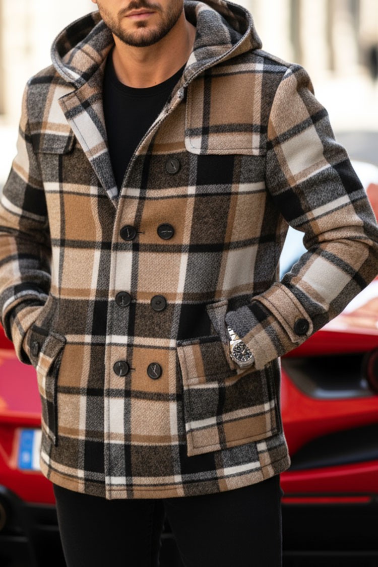 - Praktični muški kaput u bež boji s kariranim uzorkom, izrađen od visokokvalitetne i tople tkanine.
