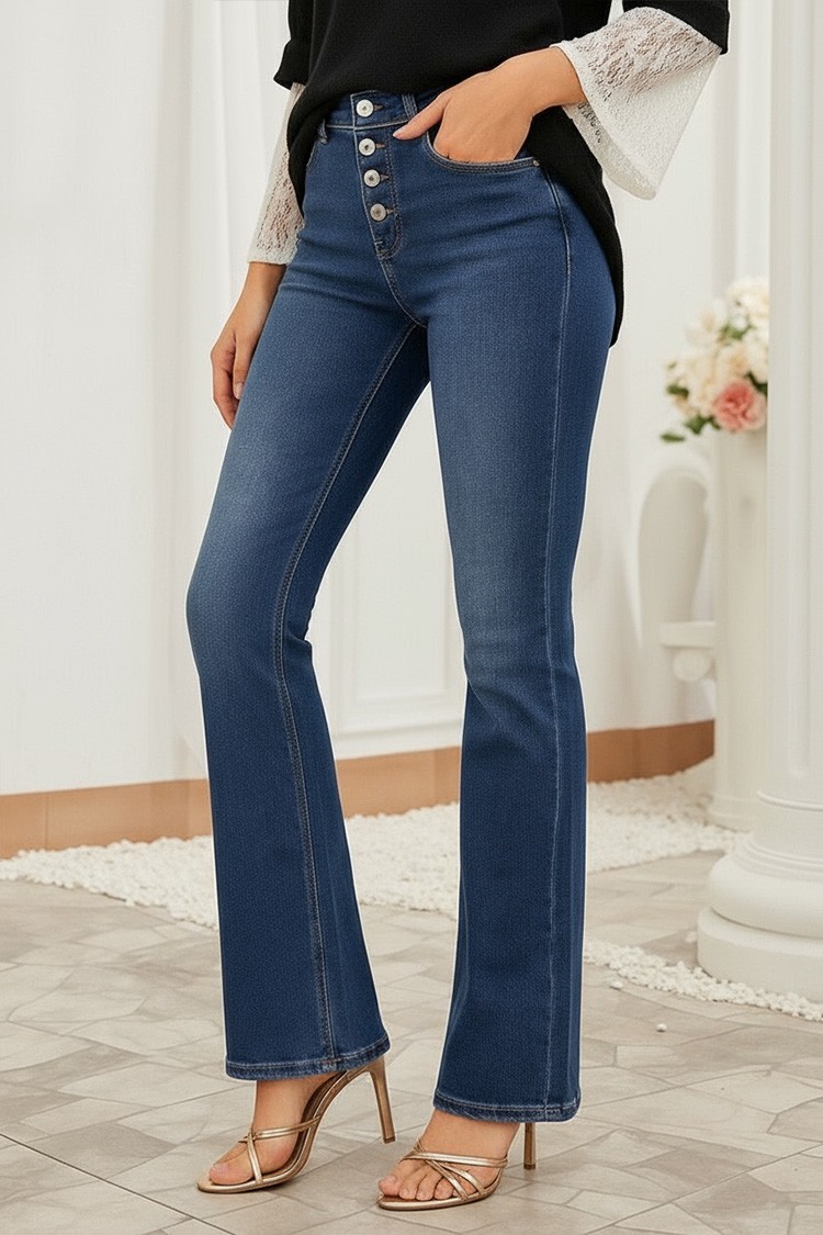 - Model ima visoki struk, pripijeni dizajn, široke nogavice i spektakularne gumbiće sprijeda.