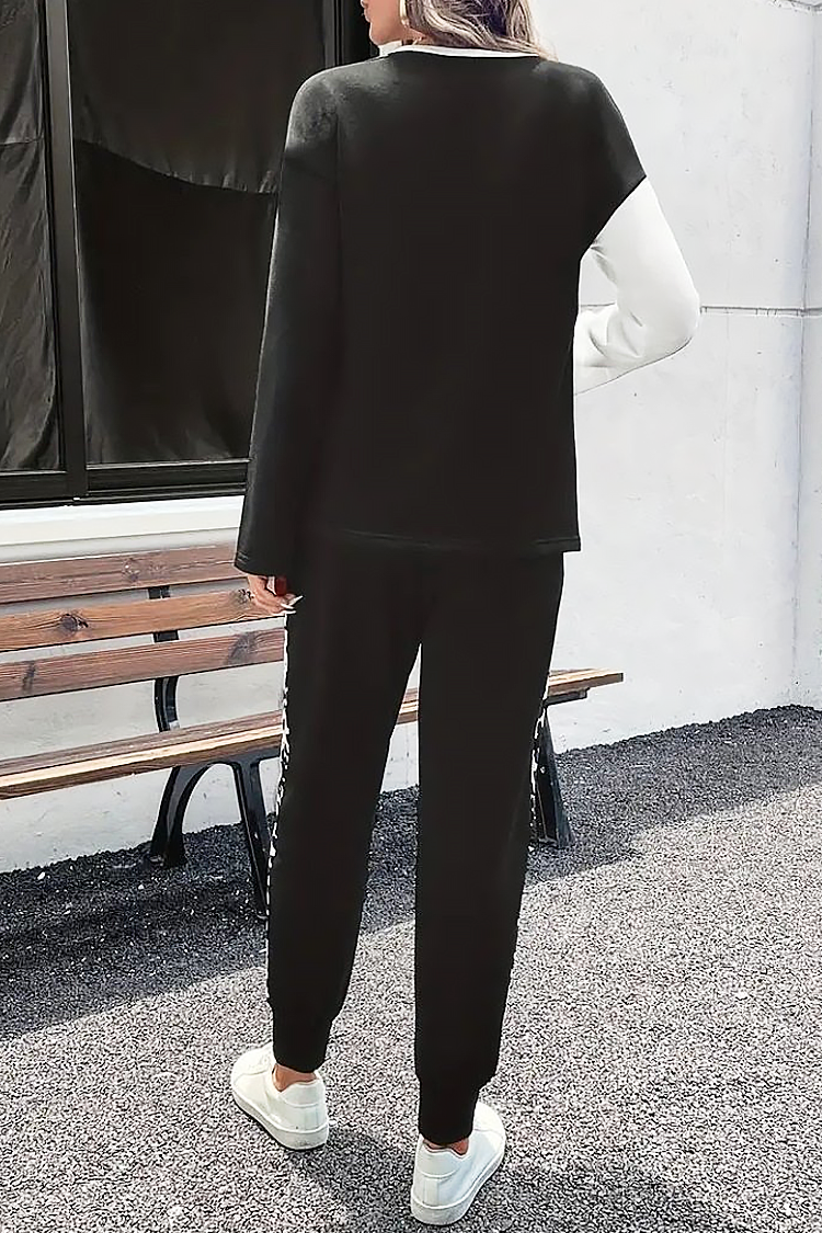 - Majica ima široki kroj i okrugli izrez, a hlače imaju visoki struk i gumicu na kraju nogavica.