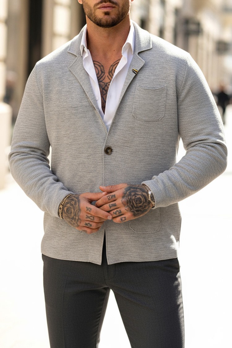 - Praktični muški kardigan u sivoj boji, pogodan za razne modne kombinacije.