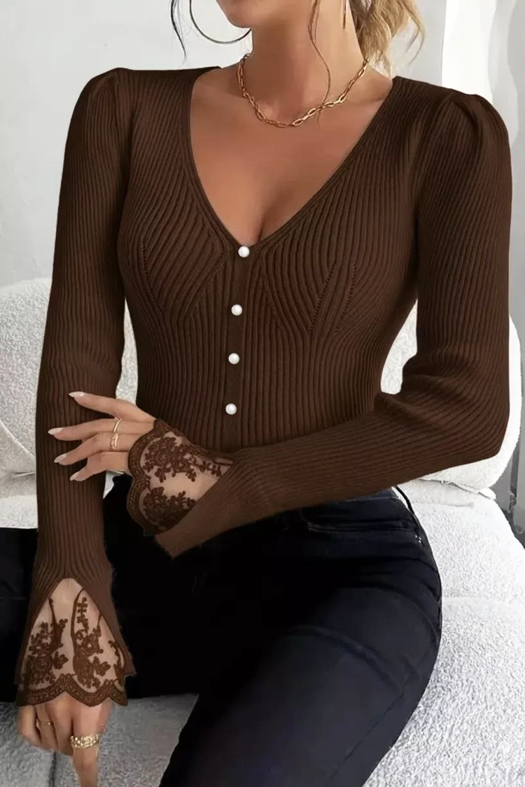 - Bluza ima duge rukave, ukrasne gumbe, pripijeni kroj i elegantan čipkasti detalj.