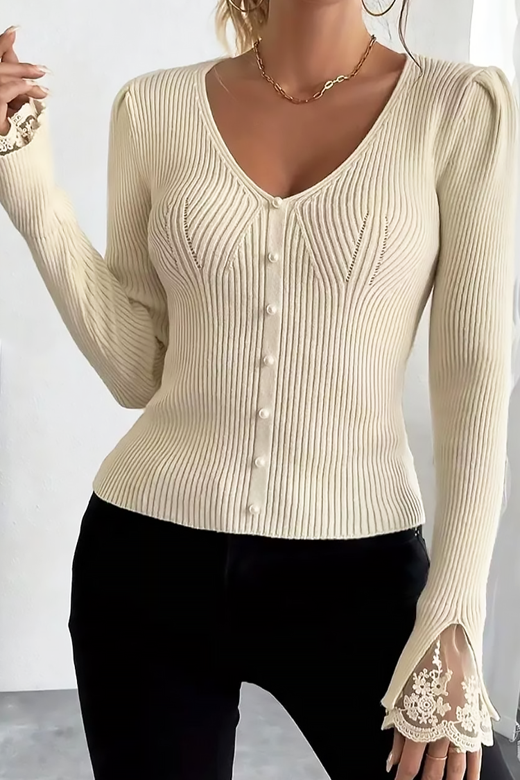 - Bluza ima duge rukave, ukrasne gumbe, pripijeni kroj i elegantan čipkasti detalj.