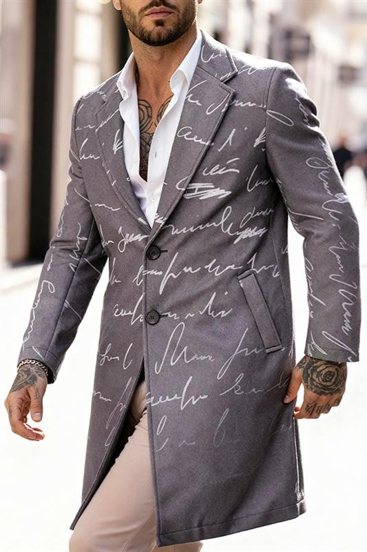 - Elegantni muški kaput s oblikovanom siluetom i spektakularnim, ručno pisanim printom.
