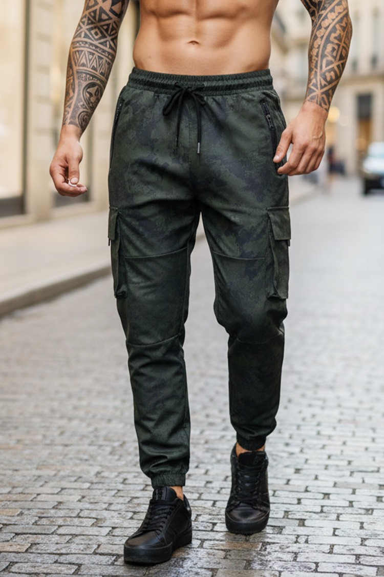 - Muške cargo hlače u kaki boji i maskirnom uzorku, prikladne za svakodnevni život.