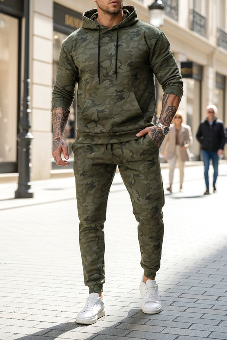 - Udoban dvodijelni sportski set s maskirnim uzorkom, koji se sastoji od dukserice s kapuljačom i hlača.