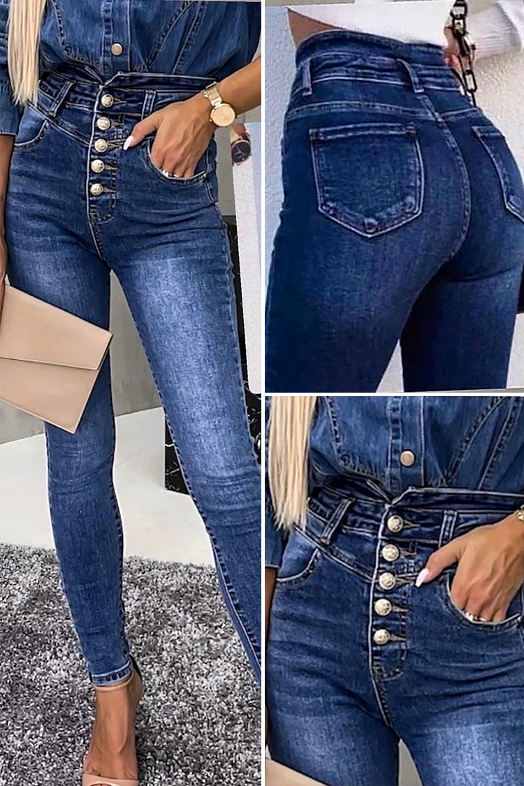 - Model ima visoki struk, pripijeni kroj, spektakularan uzorak i gumbe.