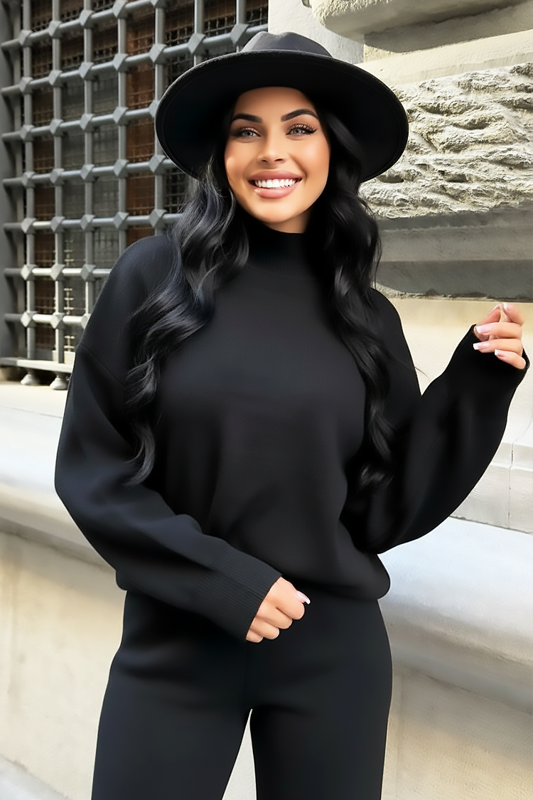 - Džemper ima visoki ovratnik i asimetrični kroj, a hlače visoki struk i široke nogavice.