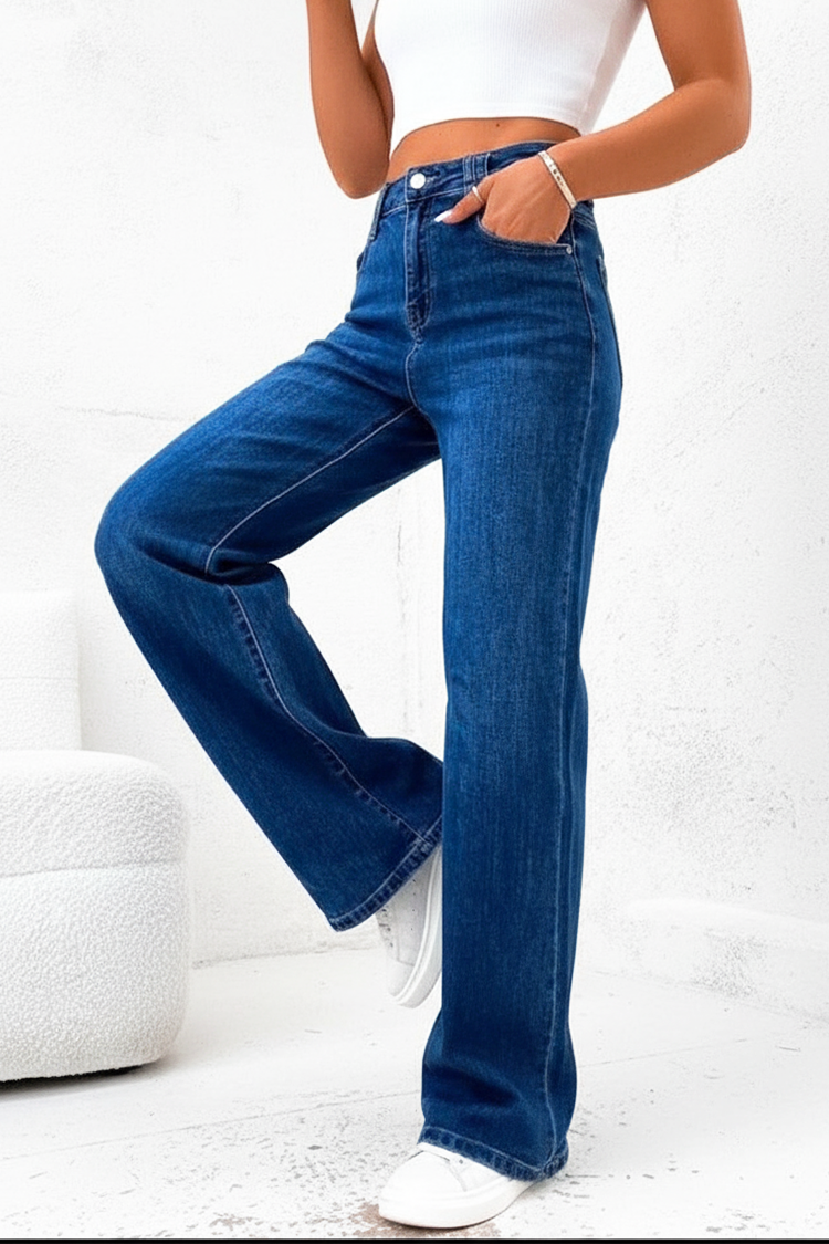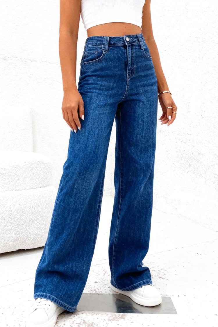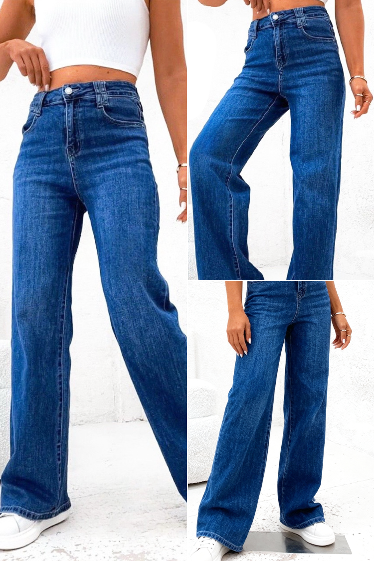 - Model ima visoki struk, širok kroj i čist dizajn.