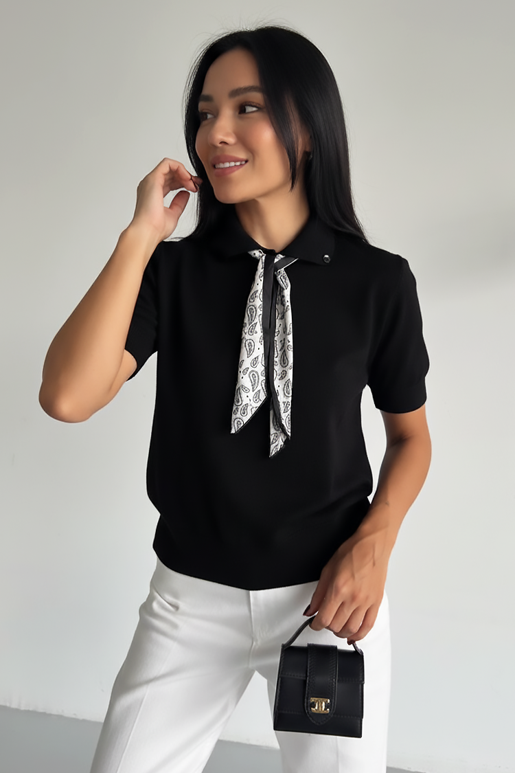 - Model impresionira elegantnim krojem, elegantnim ovratnikom, kratkim rukavima i ukrasnim šalom.