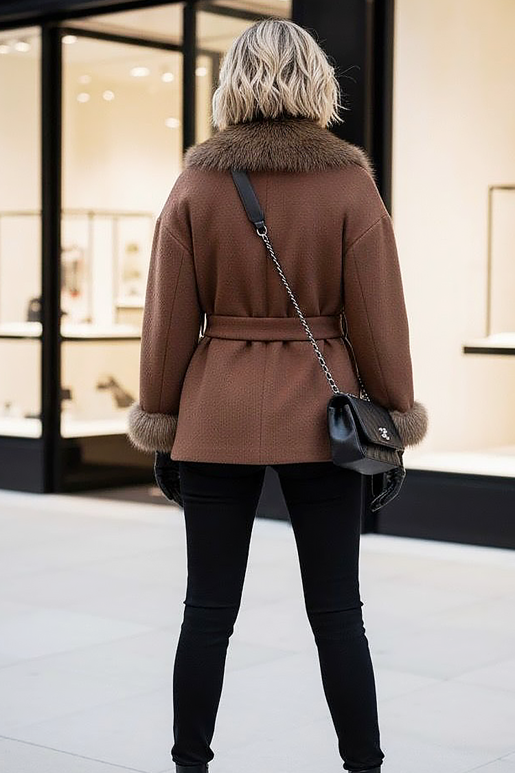 - Model ima klasičan dizajn, remen od iste tkanine i voluminozni ovratnik od perja s manžetama.
