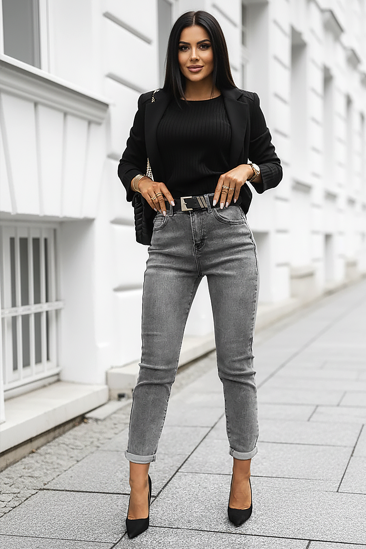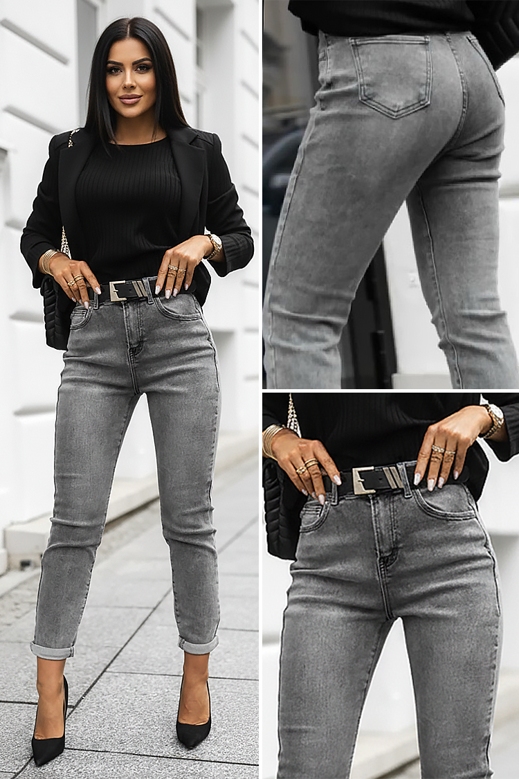 - Model ima visoki, elastični struk i precizan kroj koji naglašava figuru.