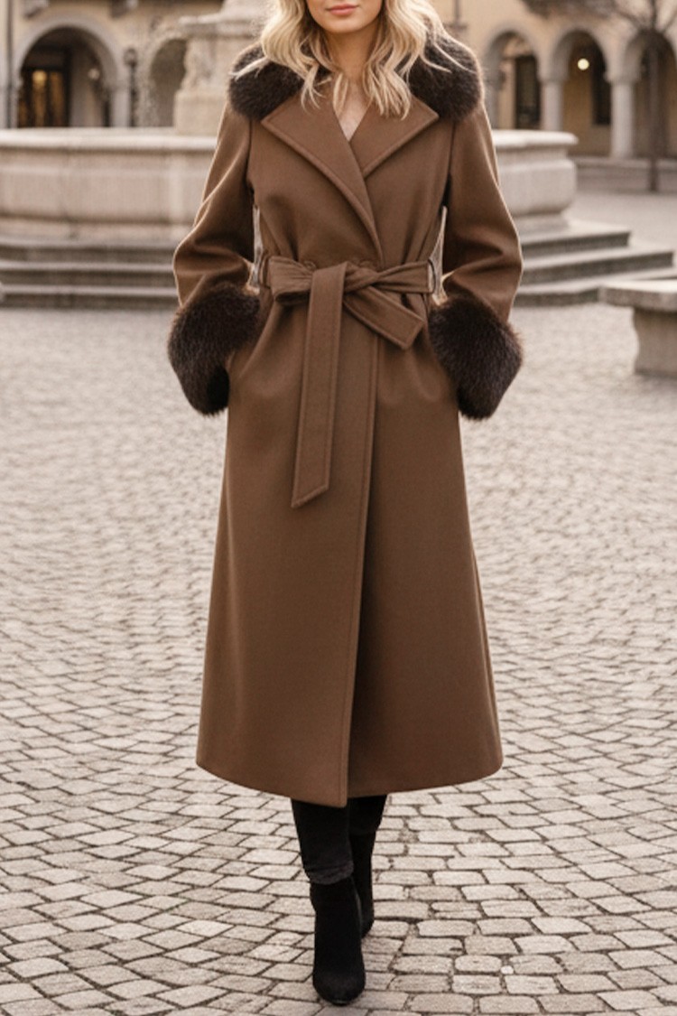 - Model ima klasičan dizajn, remen od iste tkanine i voluminozni perjani ovratnik s manžetama.