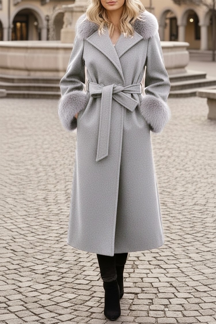 - Model ima klasičan dizajn, remen od iste tkanine i voluminozni perjani ovratnik s manžetama.