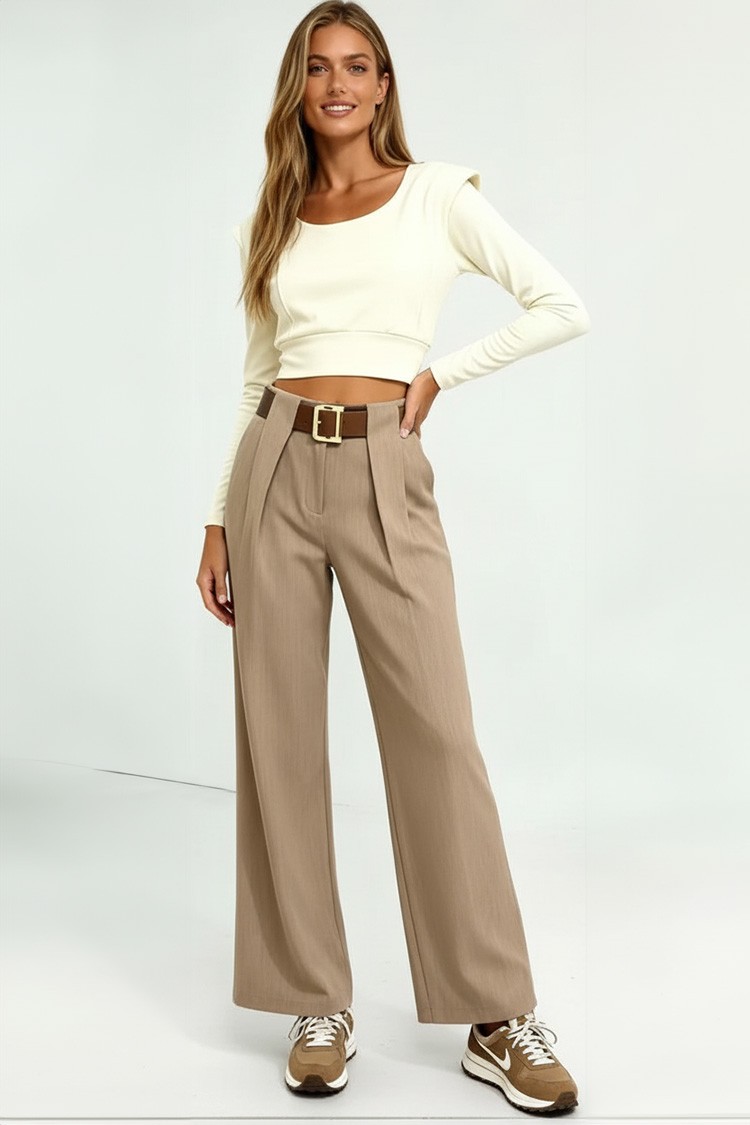 - Model ima visoki i spektakularni struk, ravan kroj i remen od eko kože.