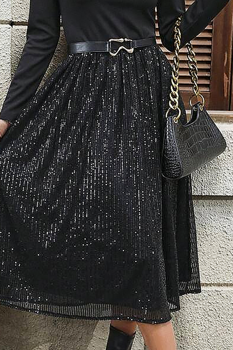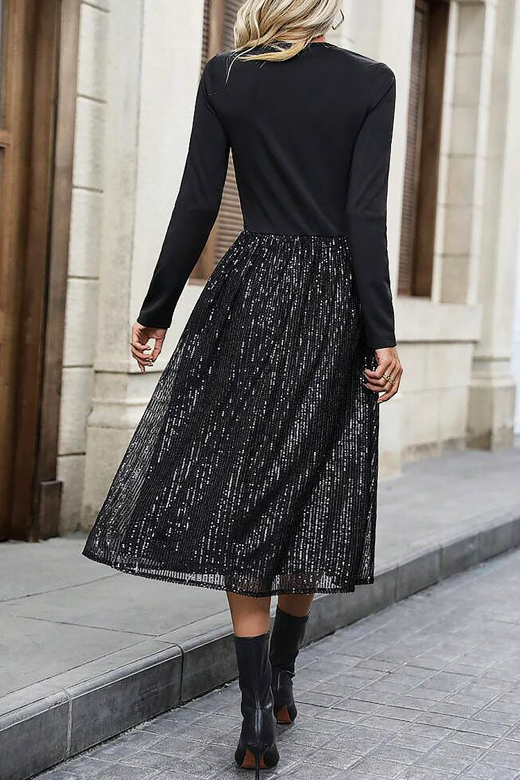 - Haljina ima udoban kroj, okrugli izrez i šljokice na dnu.