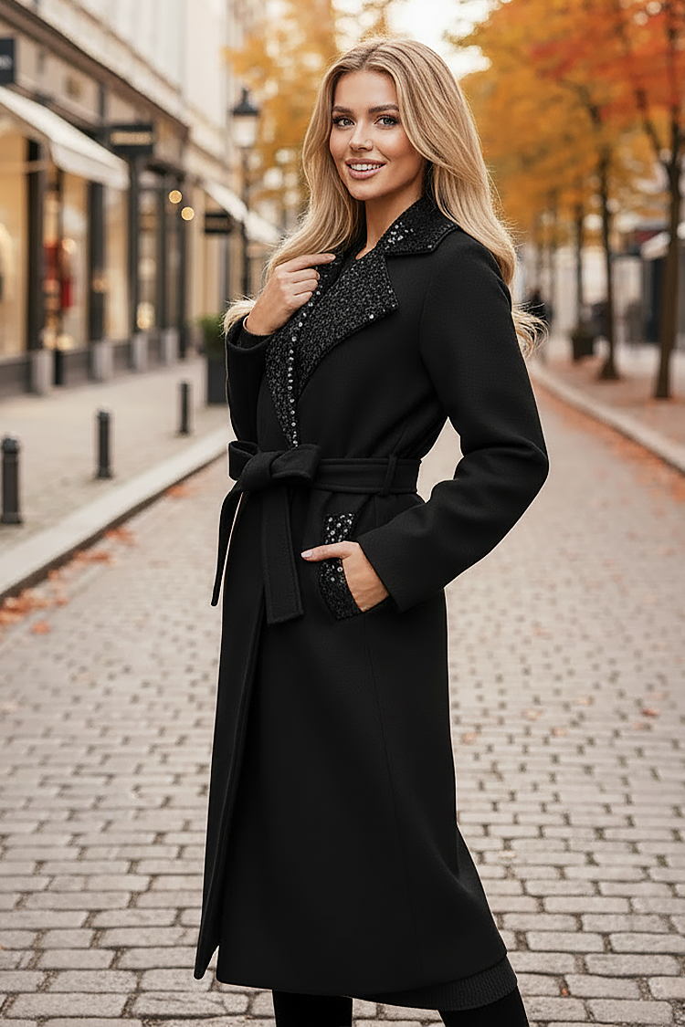 - Model ima klasičan dizajn, remen od iste tkanine i sjajne detalje oko ovratnika i džepova.