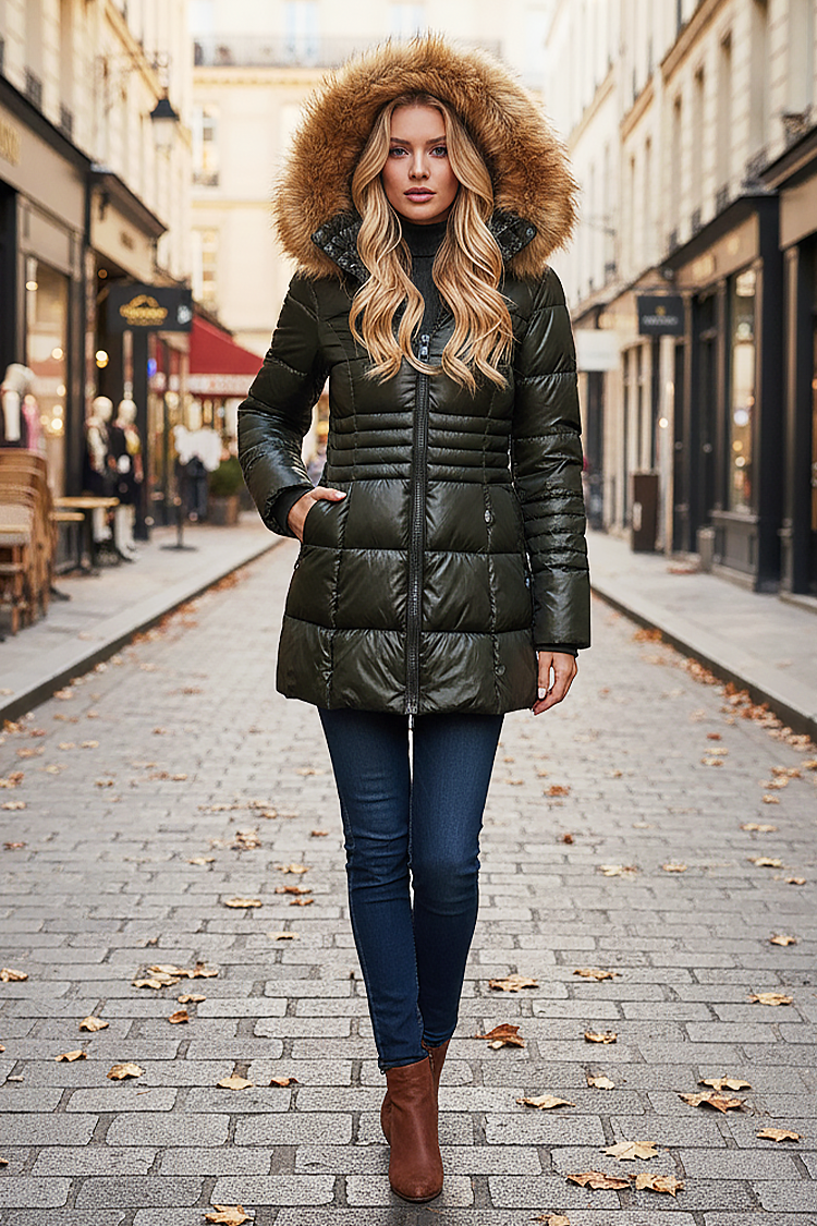 - Model ima kapuljaču s perjem i praktičnim džepovima te prošiveni dizajn.