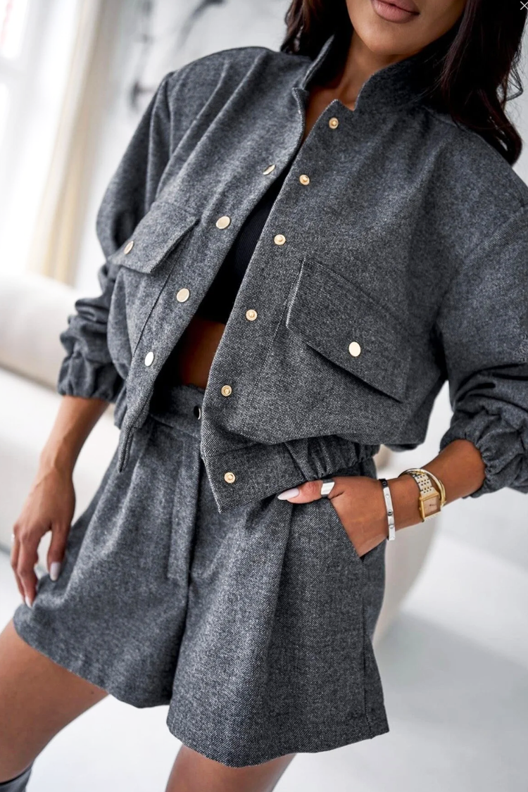 - Jakna je prijelaznog kroja, s klasičnim krojem i gumbima, a kratke hlače imaju elegantan dizajn i džepove.