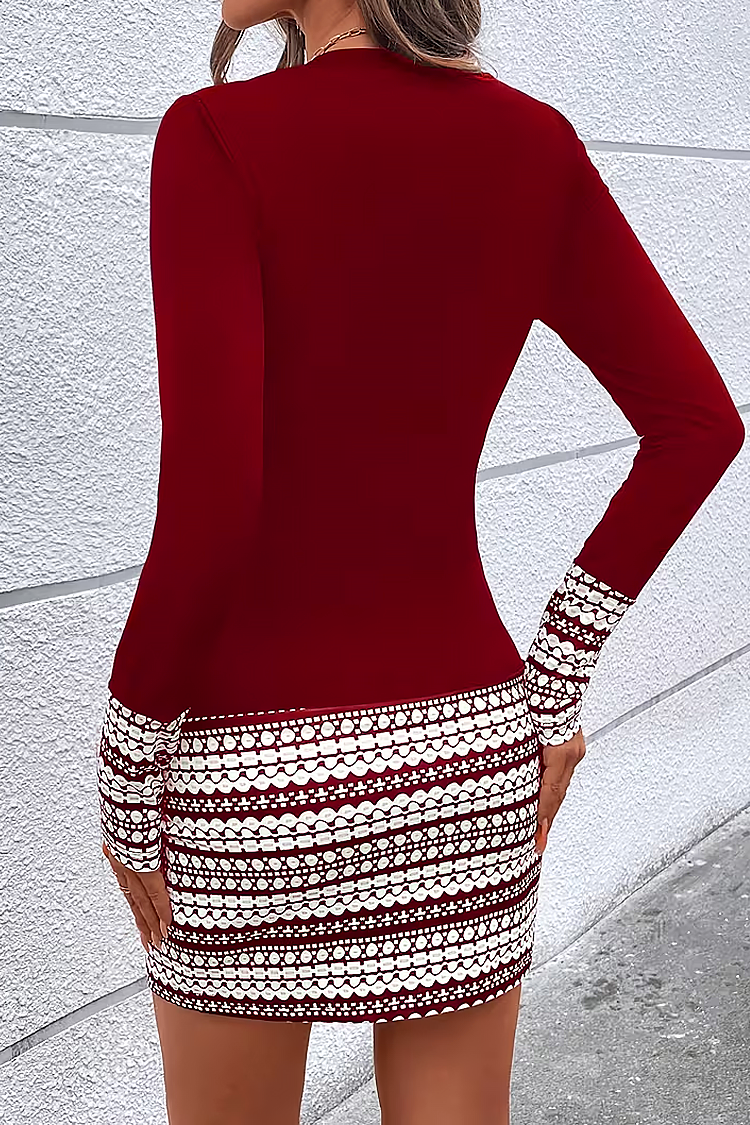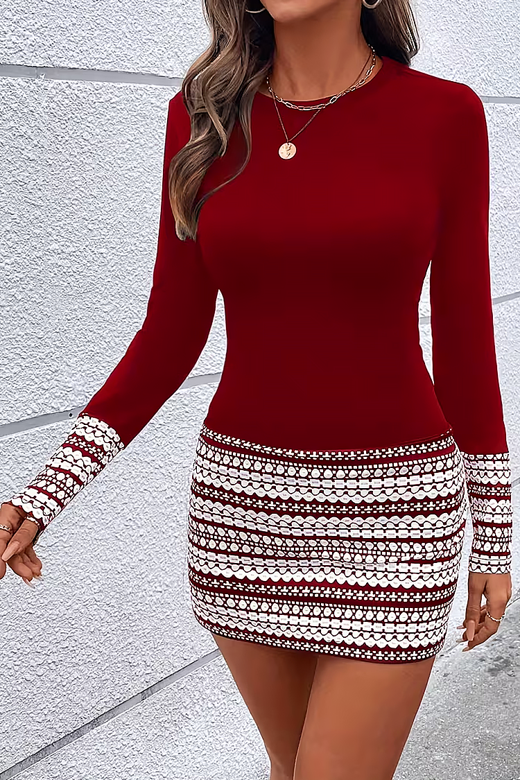 - Haljina ima udoban kroj, duge rukave i dvobojni uzorak.