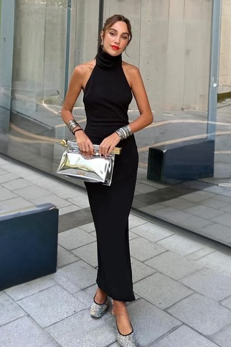 - Model ima visoki ovratnik i spektakularna gola leđa.
