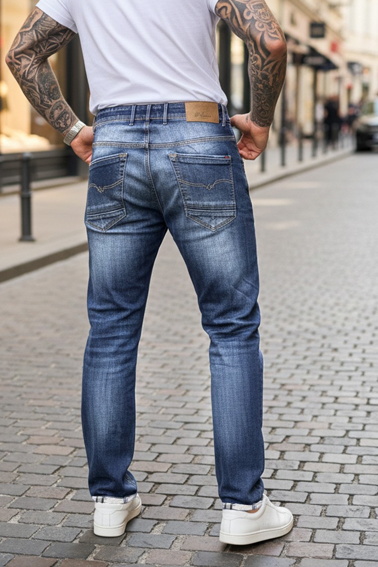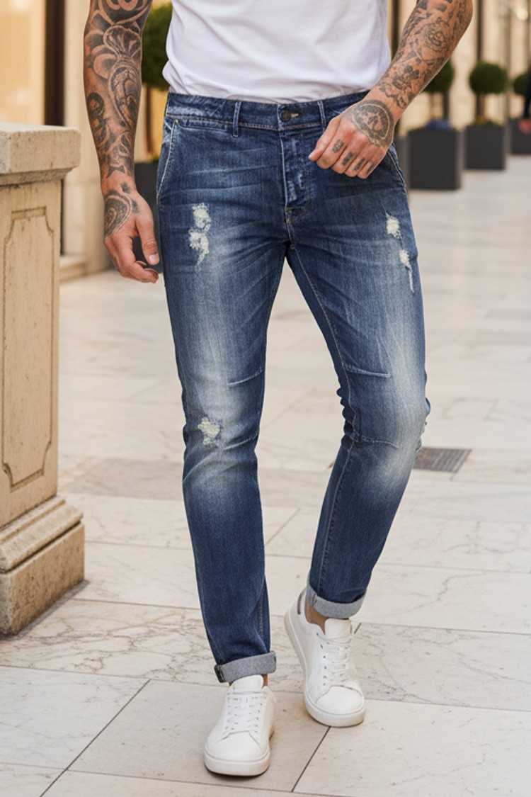 - Praktične traperice s ukrasnim poderanim i ogrebotinama na nogavicama, prikladne za svakodnevni život.