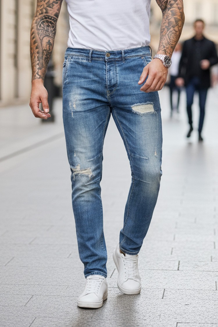 - Praktične traperice s ukrasnim poderanim i ogrebotinama na nogavicama, prikladne za svakodnevni život.