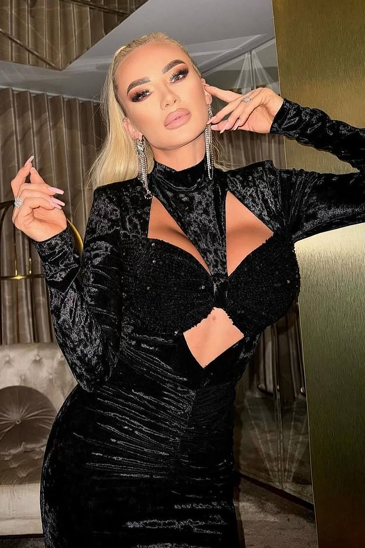 - Haljina ima pripijeni seksi kroj, duge rukave i seksi izrez.